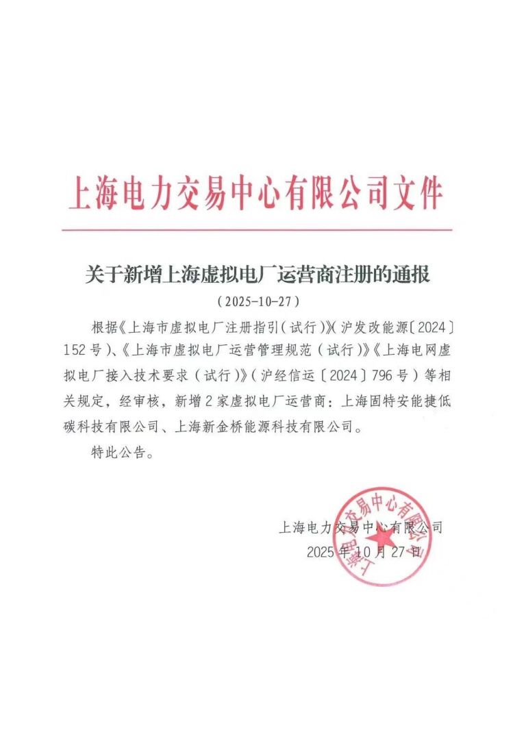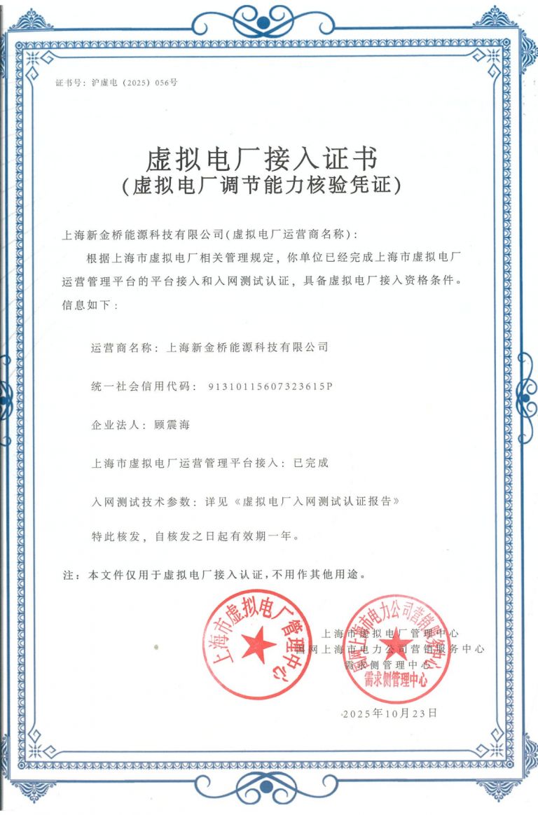 近日,上海新金橋能源科技有限公司順利通過上海市負荷管理中心及電力交易中心技術準入,成功獲得“虛擬電廠運營商資質”,成為上海市第56家虛擬電廠運營商。